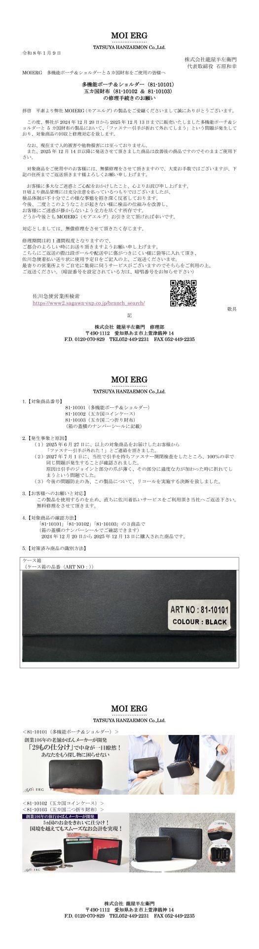 令和8年1月9日 多機能ポーチ&ショルダー「81-10101」.五カ国財布「81-10102&81-10103」のリコールについて